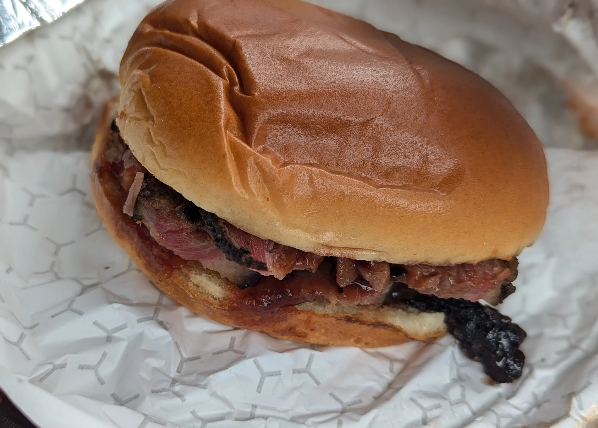 Specifically, the meat was perfectly smoked, with delicious burned tips. Meanwhile, the sauce was tangy, with a light sweetness and a pleasant heat that sneaked in about halfway through my sandwich. One aspect I did note was that my sandwich was made up primarily of edge pieces, meaning plenty of char and also a large amount of fat.